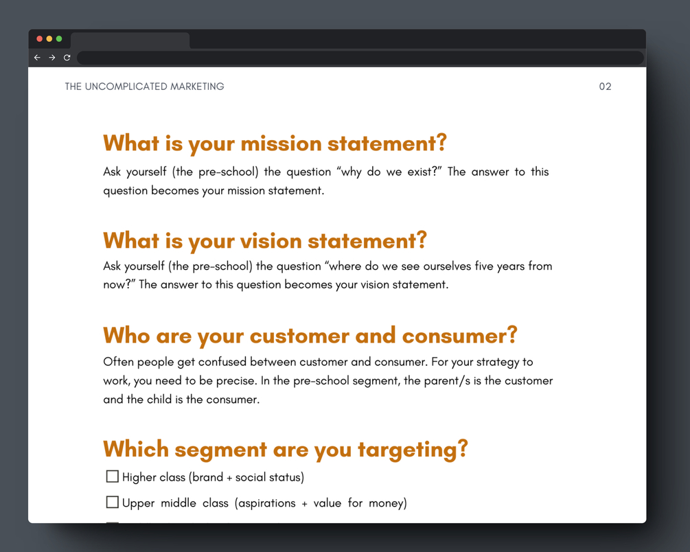 Look no further than The Uncomplicated Marketing for Preschool! In this eBook, I have provided concise, actionable strategies that any preschool or even a startup can use to increase admissions (sales) and brand awareness.