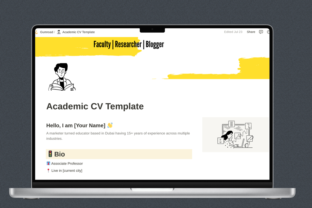 Highlight your teaching, research publications, and overall academic experience with a notion academic CV.